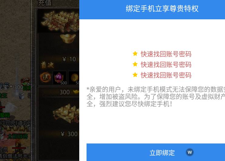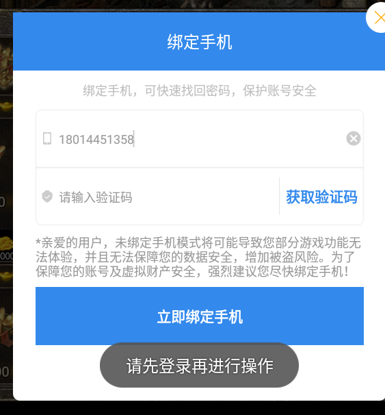 应用宝原始传奇。点击充值完成后就出现一个弹窗,绑定手机,但是输入手机却无法获取验证码,一直提示登录!必须大退才能进游戏,关都关不了。希望官网能修复下