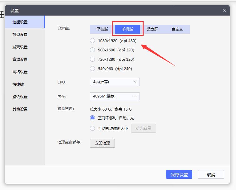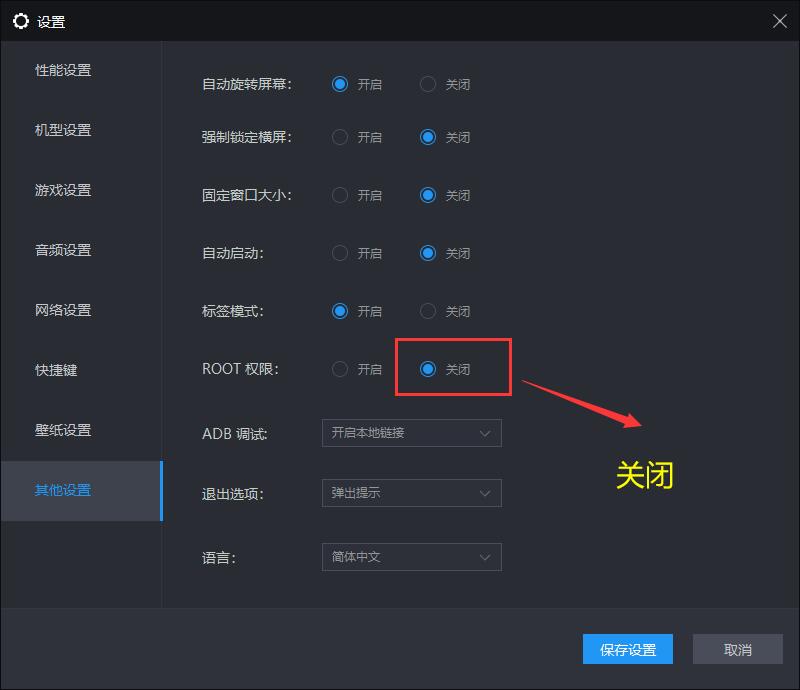 2,然后点击左侧其他设置,找到ROOT权限,勾选关闭按钮,然后点击保存,然后点击左侧性能设置,将分辨率设置为手机版,再次点击保存,重启模拟器如图:
