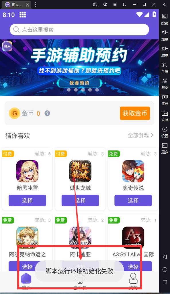 一打开软件就提示运行环境异常,注册登陆后也无法运行鸟人助手里任何免费脚本。