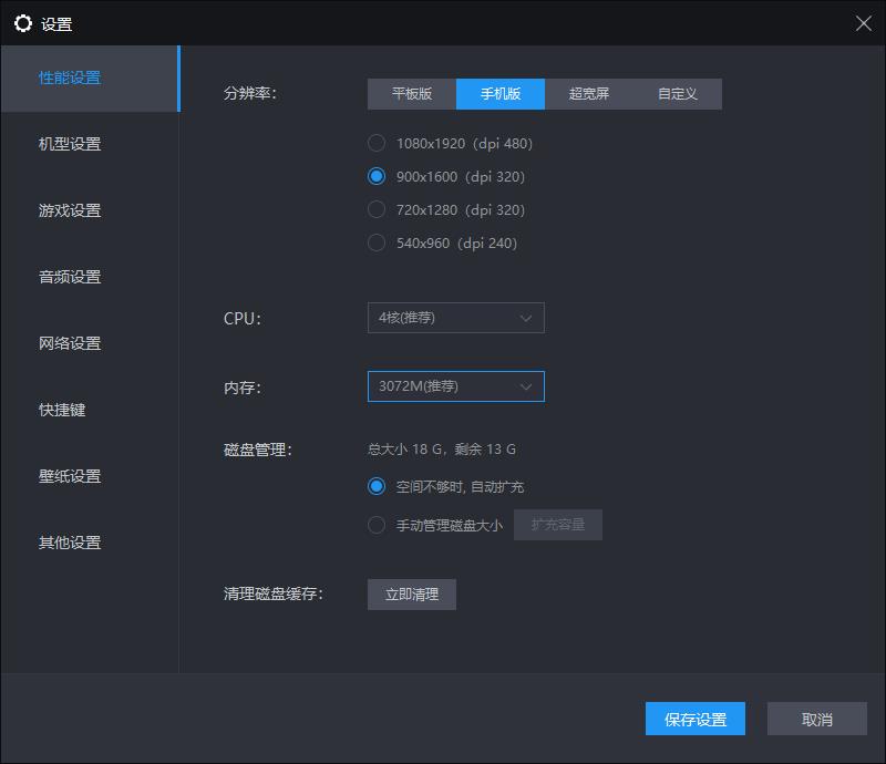 2,安装完成后打开模拟器,点击右上角菜单-软件设置-性能设置-手机版分辨率-900:1600,如图: