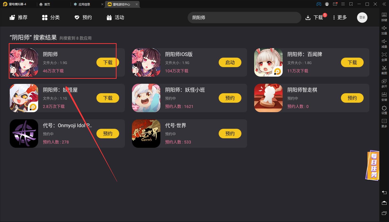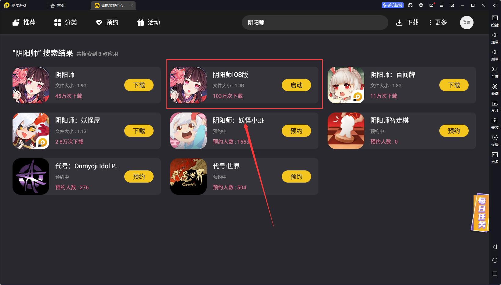 2,安装完成后打开雷电游戏中心,搜索阴阳师,然后下载阴阳师ios版本即可使用。