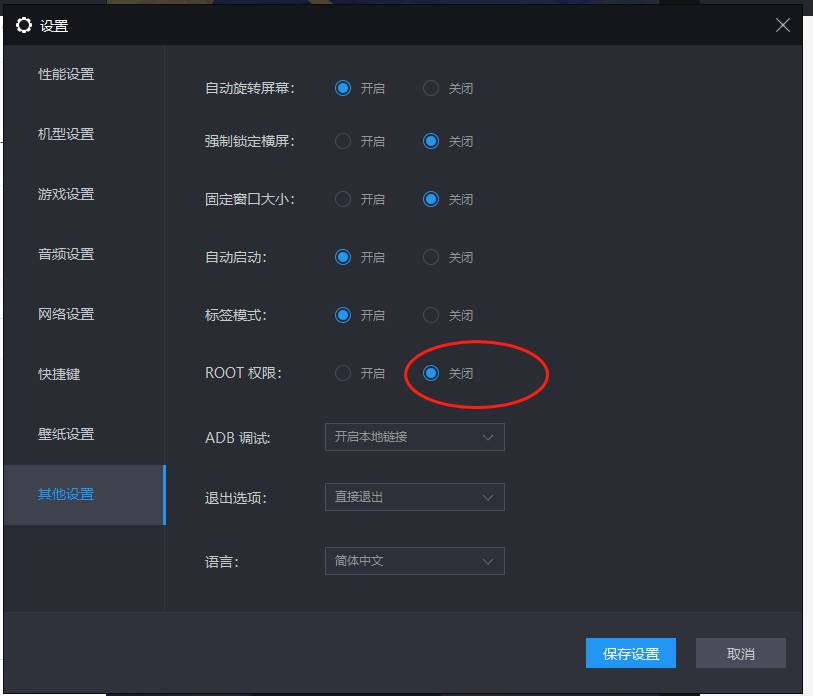 2,打开模拟器右上角菜单-软件设置-其他设置-root权限,勾选关闭之后,保存设置然后重启模拟器