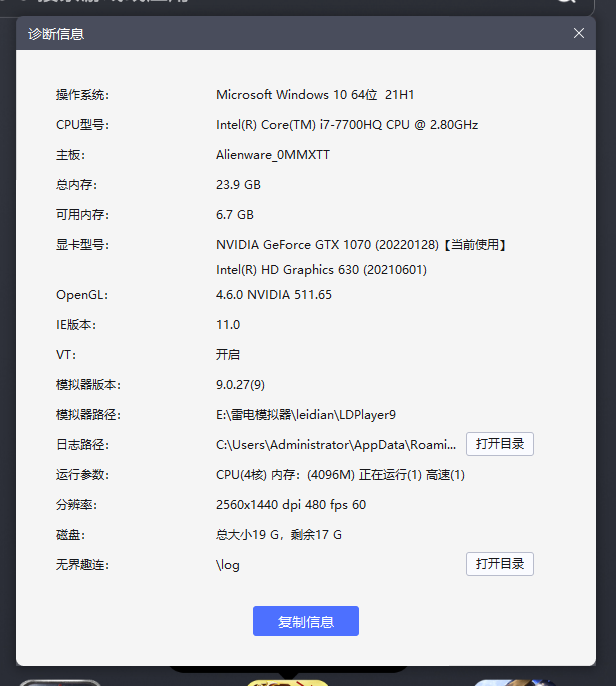 (1)打开模拟器右侧设置,在【性能设置】中自定义分辨率:2560x1440,dpi480
