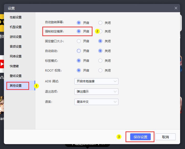 (2)继续在模拟器设置中的【其他设置】把“强制锁定横屏”
