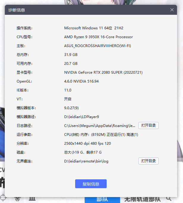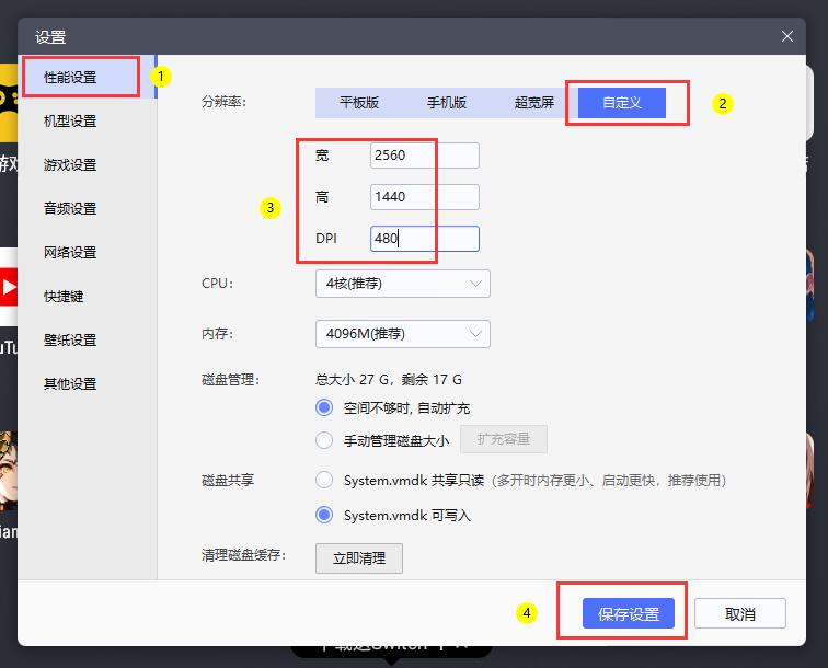 (1)打开模拟器右侧设置,在【性能设置】中自定义分辨率:2560x1440,dpi480
