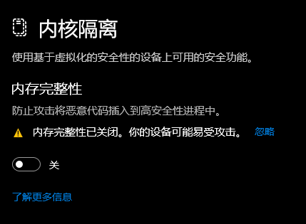 但是微软自带杀软这个就关闭了。打开内存完整性每次打开模拟器就弹窗,关闭内存完整性后模拟器就不弹窗