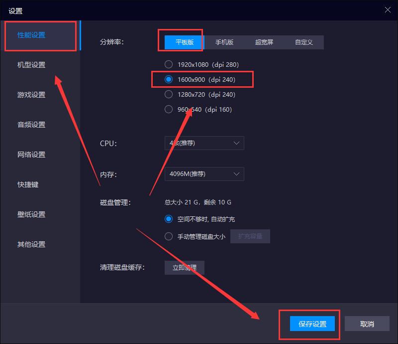2,然后在【性能设置】里选择【平板版】的分辨率,大小可根据自己的喜好选择,设置完之后记得点击【保存设置】,然后在弹出重启提示时,选择【立即重启】