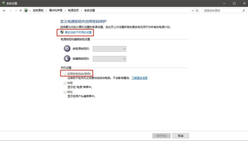 按照方法进电源选项 找不到“当前不可用的设置” 也就没有取消快速启动这个选项