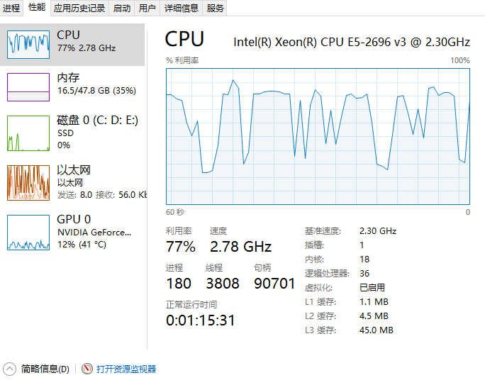 除CPU,其他都是同样配置。。2678V3可以开16个不卡。但是2696v3的CPU开到8-9个号时就卡的要命,试了很多办法,换了5-6个win10系统,更改了很多设置都不行!求帮助!下面是图片!