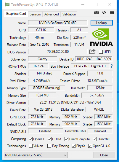 显卡型号:NVIDIA GeForce GTS 450 (20180323)