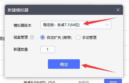 3、模拟器版本选择【安卓7.1(64位)】,点击确定即可成功创建