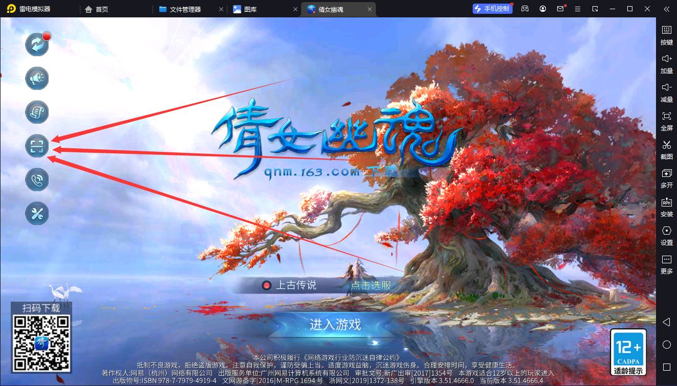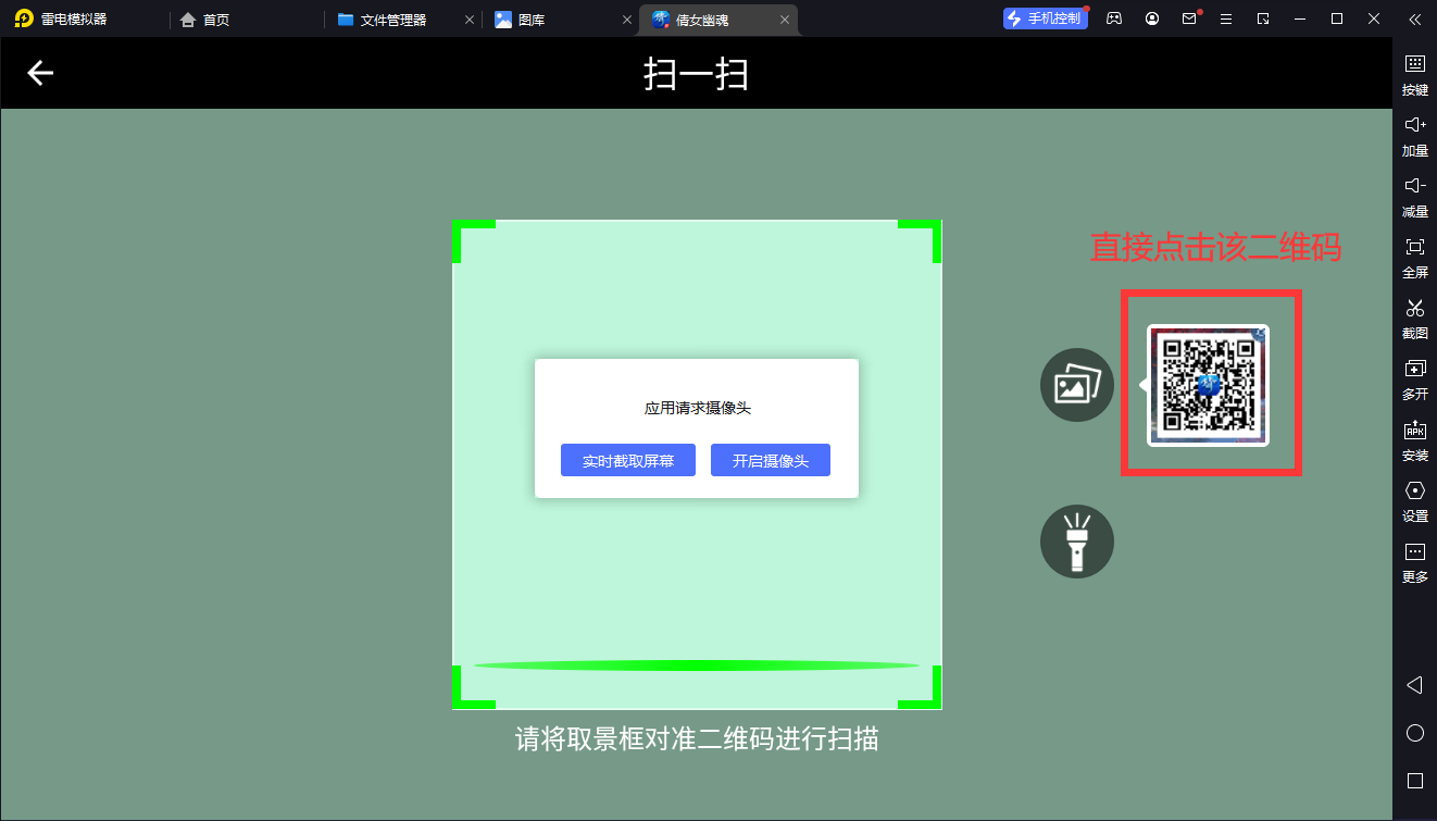 步骤四:最后一步,打开雷电模拟器,打开倩女幽魂,使用扫码功能,直接读取刚刚的图片即可,可参考下图的操作