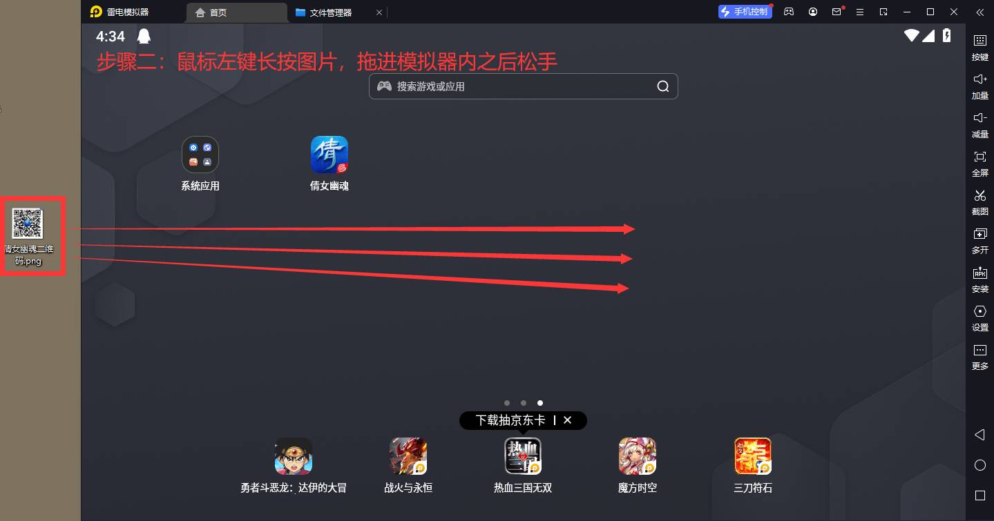 步骤二:鼠标左键长按二维码图片,然后拖进模拟器内之后就可以松手了(这一步是上传图片到模拟器里)