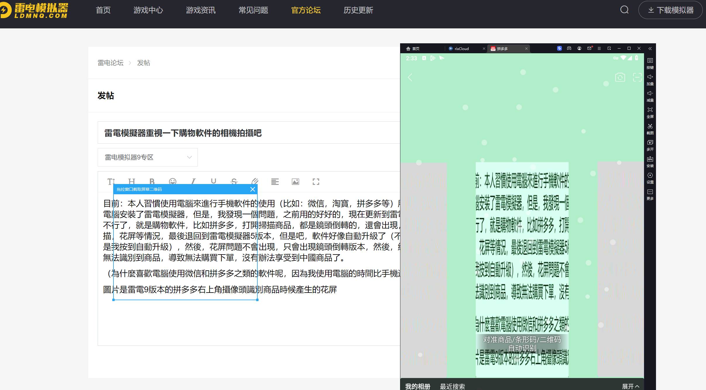 目前:本人習慣使用電腦來進行手機軟件的使用(比如:微信,淘寶,拼多多等)所以選擇了電腦安裝了雷電模擬器,但是,我發現一個問題,之前用的好好的,現在更新到雷電9版本就不行了,就是購物軟件,比如拼多多,打開掃描商品,都是鏡頭倒轉的,還會出現,無法掃描,花屏等情況,最後退回到雷電模擬器5版本,但是吧,軟件好像自動升級了(不知道是不是我按到自動升級),然後,花屏問題不會出現,只會出現鏡頭倒轉版本,然後,結果就是,無法識別到商品,導致無法購買下單,沒有辦法享受到中國商品了。