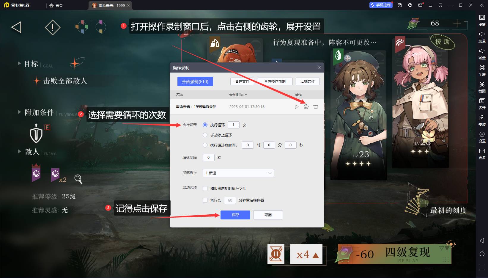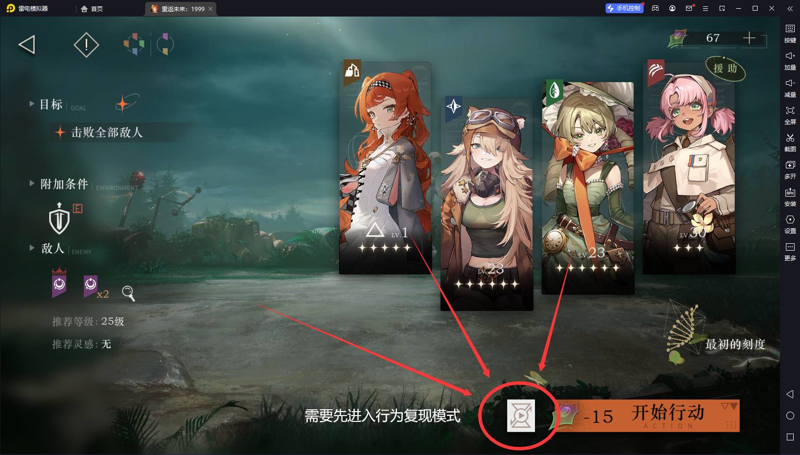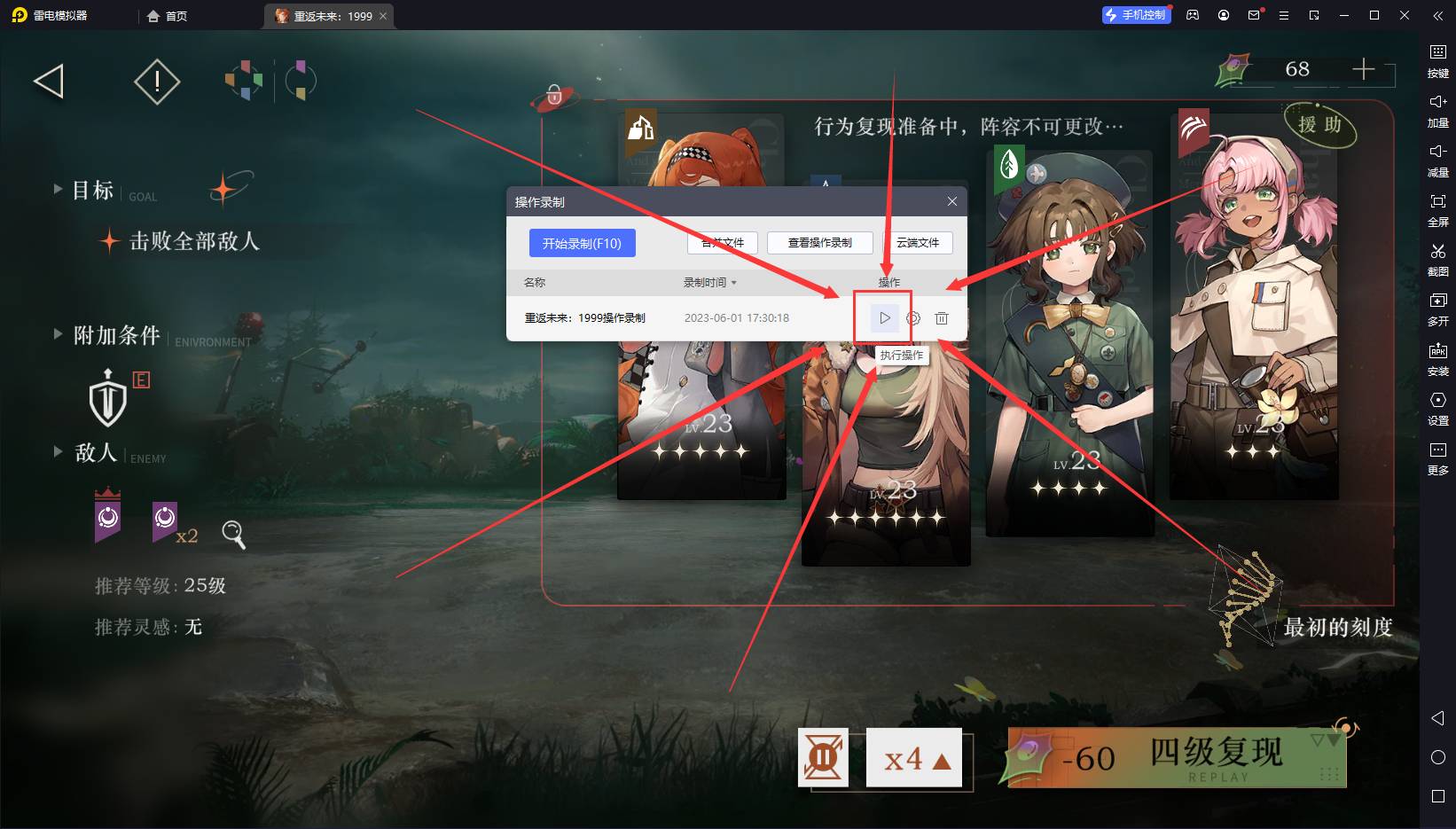 4、接着返回模拟器内,并进入游戏,选择需要自动刷的关卡,打开行为复现模式