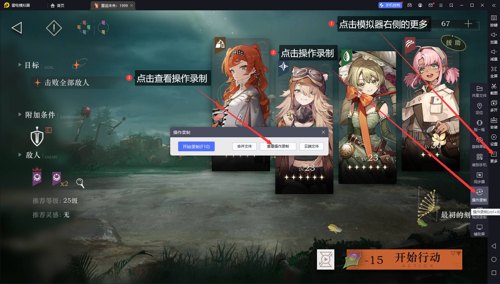 2、点击模拟器右侧-更多-操作录制(也可以直接按Ctrl+8弹出),接着点击查看操作录制,可以根据下图步骤操作