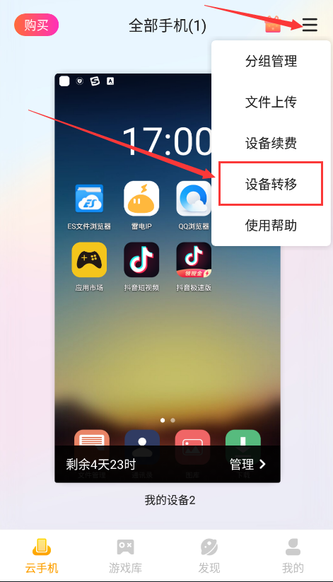 2、在云手机界面,点击右上角三条杠,点击“设备转移”