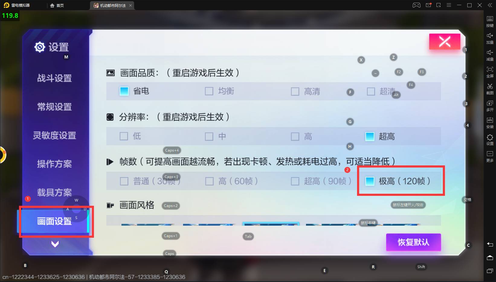 4、在画面设置中把帧数设置为【极高(120帧)】即可