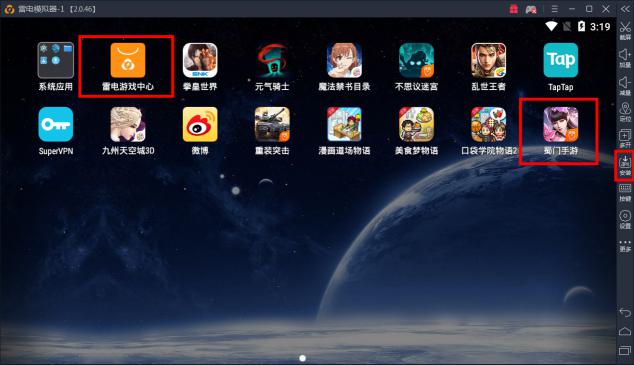 二、打开雷电安卓模拟器,在雷电游戏中心搜索“蜀门手游”进行下载,或通过模拟器右侧栏目里面的APK安装功能打开下载到电脑上的游戏安装包。