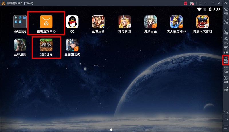 二、打开雷电安卓模拟器,在雷电游戏中心搜索“我的世界”进行下载,或通过模拟器右侧栏目里面的APK安装功能打开下载到电脑上的游戏安装包。