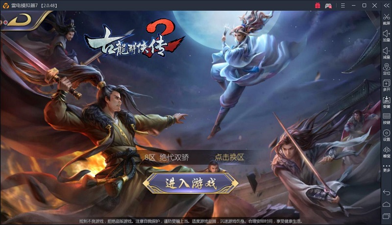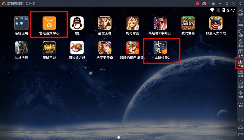 二、打开雷电安卓模拟器,在雷电游戏中心搜索“古龙群侠传2”进行下载,或通过模拟器右侧栏目里面的APK安装功能打开下载到电脑上的游戏安装包。