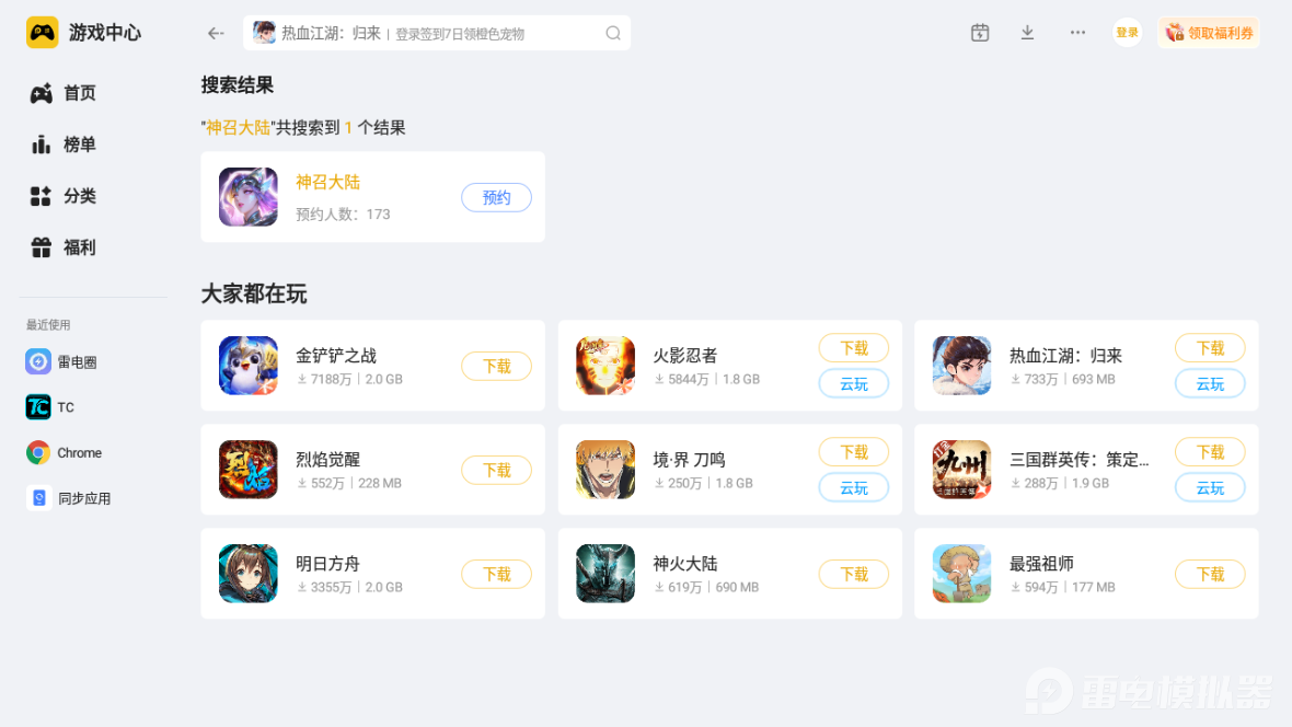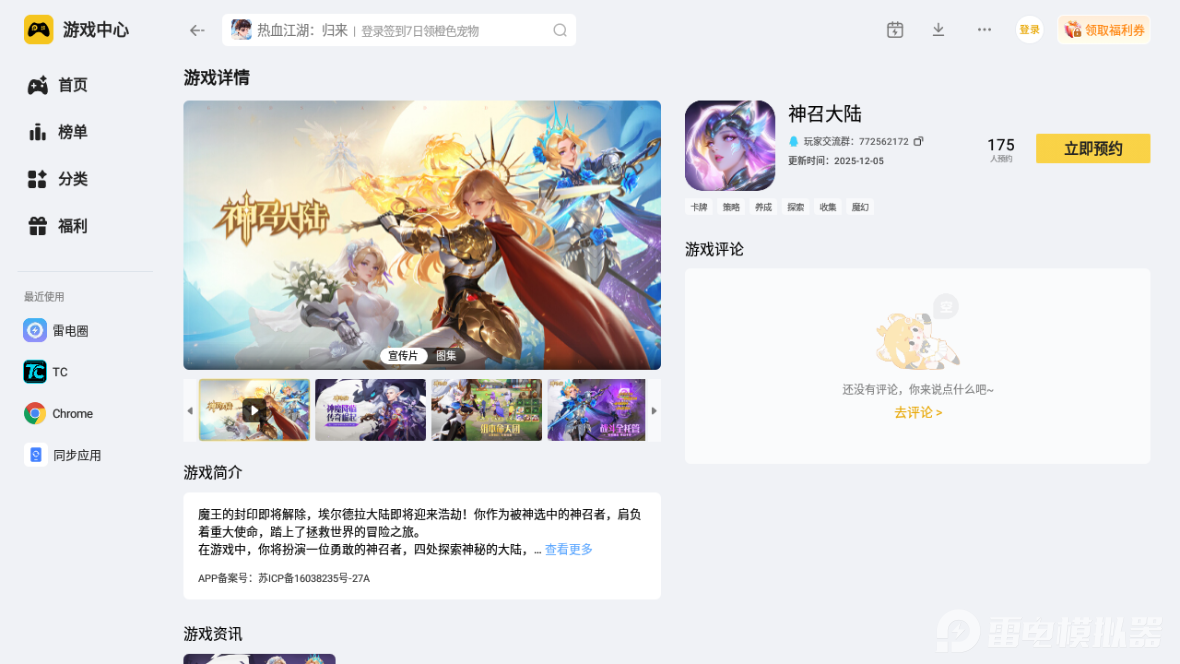 根据小编的了解,如果大家打算去使用模拟器来体验此类手游,那么雷电模拟器这种多功能的电脑模拟器就很适用了,不仅带来了超全的游戏榜单,更是有着详细的分类,而且我们只需打开“雷电游戏中心”搜对应的游戏名进入专区,然后去点击预约就可以了。
