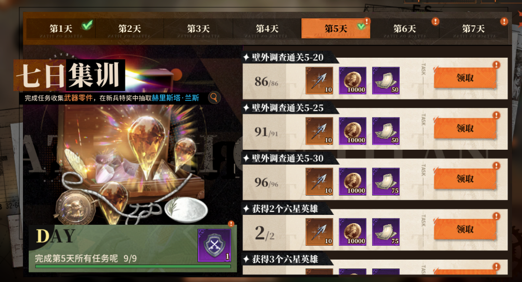 7天每一天的任务都不一样,只要每天完成任务就能领取奖励,武器零件是必要的,所以每天必须登录完成任务。