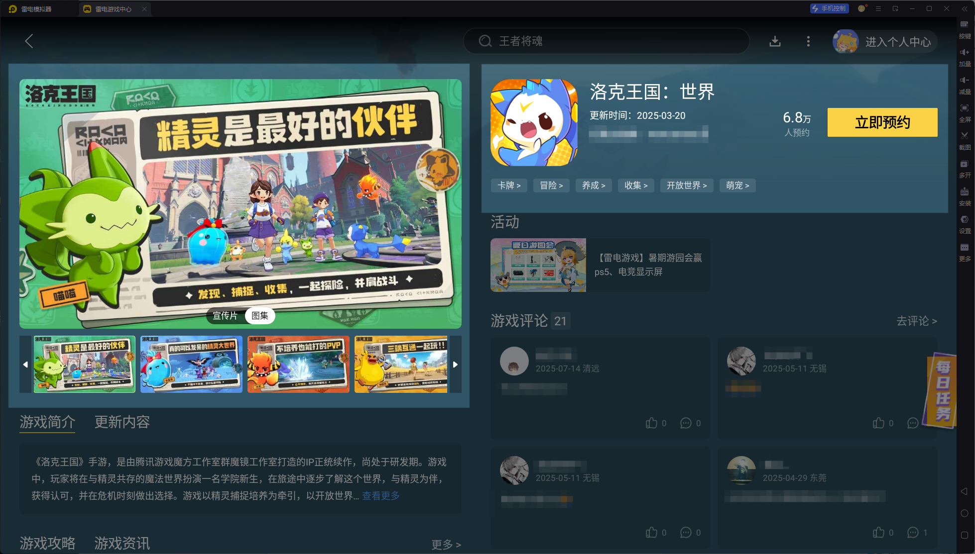 我们可以打开雷电模拟器,搜索洛克王国世界,点击立即预约,等到游戏正式上线就会自动为你进行下载,届时即可登录游戏开启神奇之旅啦!