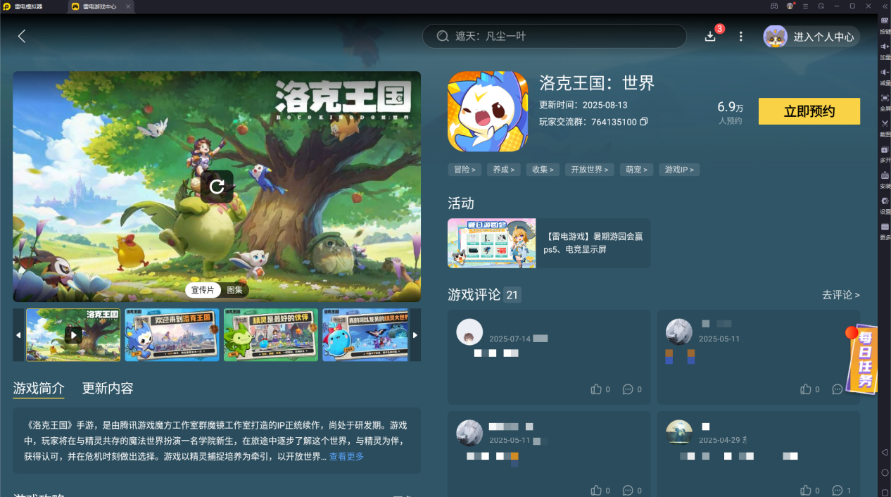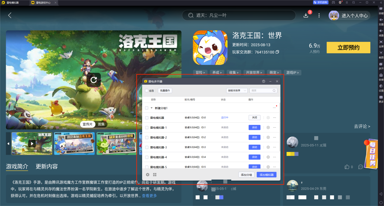 建议大家使用雷电模拟器游玩这款游戏,该模拟器可以多开游戏,培养账号的效率很快,游戏的帧数稳定在165帧数。还有游戏专属群聊,让大家随时分享游戏的最新消息,能在群里面找到自己的游戏伙伴,增加精灵的交换概率。除此之外,支持手柄键鼠等外设随意切换,支持修改自定按键,还能积攒积分,抽取游戏福利。