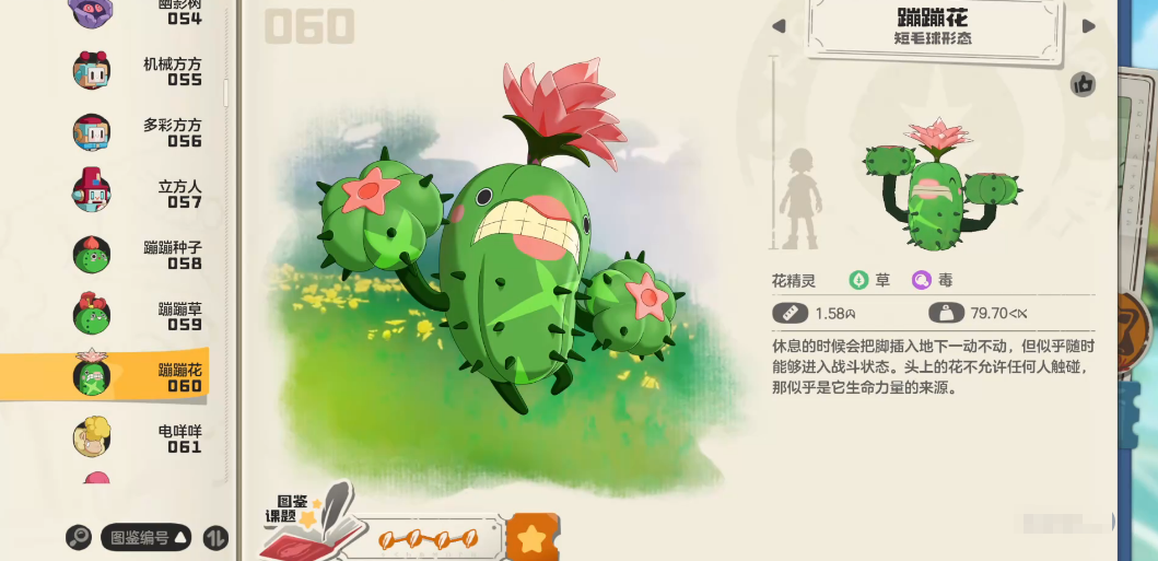 在游戏的设定中,蹦蹦花兼具草系、毒系的双重属性,因此在战斗中能灵活应对不同敌人,并利用属性克制优势造成更高伤害,进化路径上,大家可以直接从初始形态“蹦蹦种子”开始,需在宠物园捕捉,升至16级进化为“蹦蹦草”,再提升至32级即可成为终极形态蹦蹦花,身上开着巨大的花朵,头部花朵为其能量核心且是禁止触碰的,非战斗时则是会伪装融入环境。