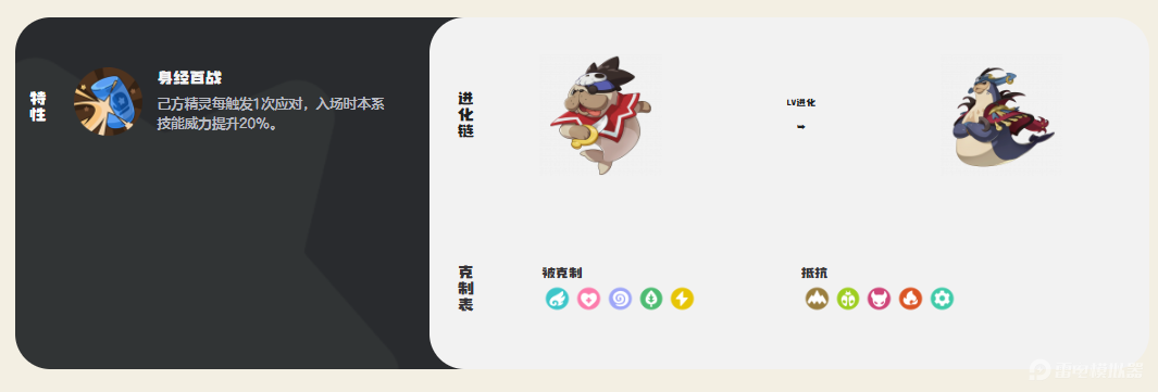 1、特性方面:身经百战,游戏里面的超神特性,可以在队伍触发应对之后,让精灵的本系技能伤害提升20%,依靠应对的防御技能,可以消耗敌人跌加被动,最后秒杀敌人。