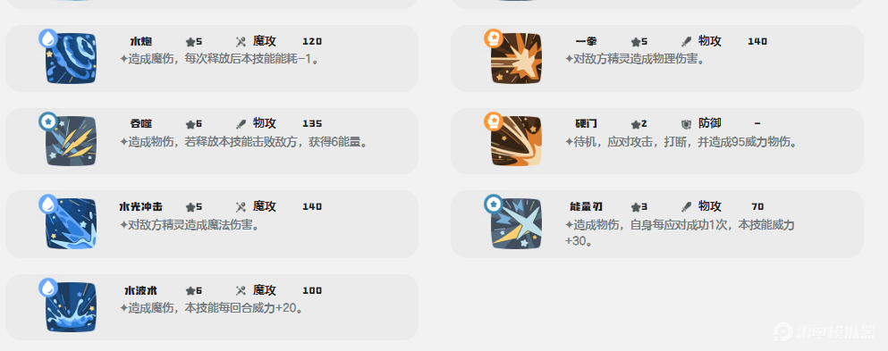 1、普通技能:低等级的技能基本没有多大的作用,推荐后期的几个技能,例如水炮、水光冲击、一拳和硬门,都是本系的强力技能,威力都非常的高,能够弥补该精灵双攻数值低的缺点。