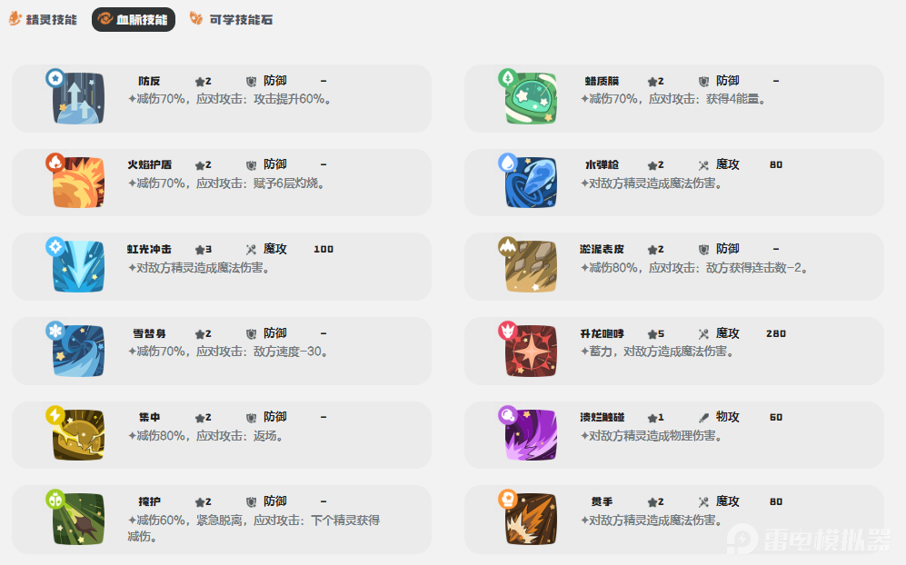 2、血脉技能:该精灵的血脉技能强度非常的高,防反可抵御70%伤害并且提升60%的攻击,蜡质膜减伤70%获得四点能量,火焰护盾70%伤害减免并给敌人6层烧伤效果,淤泥表皮减伤80%减少对方2层连击,集中减伤80%直接返厂,掩护更是神技减伤60%然后换队友上场享受减伤效果。该精灵的血脉技能需要一两个针对特殊环境,并且能够触发被动效果,建议孵蛋的时候多孵化几只不同组合的。