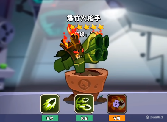 爆竹火枪手下次攻击将会向右侧1行连续发射2枚子弹,对命中的1个敌方单位造成自身攻击力100%的伤害,并附带击退效果。