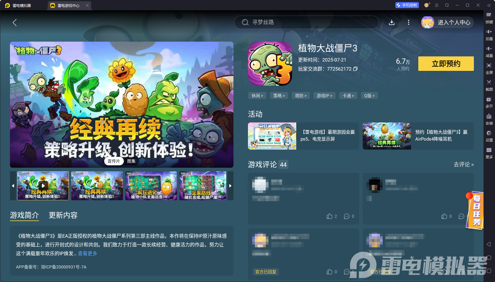 提到植物大战僵尸这个经典IP,无数玩家都期待能在电脑上重温塔防策略的乐趣。想要在电脑上实现植物大战僵尸3电脑版下载安装?雷电模拟器是目前最稳妥、最接近“电脑版”体验的官方推荐方案!下面给大家带来植物大战僵尸3电脑版下载安装教程: