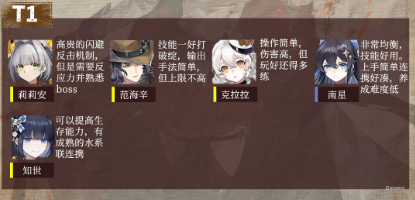 T1梯队的角色也各有亮点,莉莉安拥有高贵的闪避反击机制,不过需要玩家熟悉 BOSS 机制才能更好发挥;范海辛技能一能有效打破绽,输出手法简单,但上限相对不高;