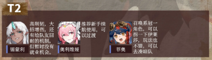T2梯队里,锡蒙利高削韧,大招增伤还能给队友回耐,可惜暂时缺乏就业机会;奥利维娅适合新手用来续航过渡;菲奥作为召唤系冠一角色,能拐伊莱莎,玩法不错,也可用于凑暗队。