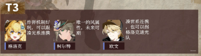 T3梯队的角色,格洛克的炸弹机制有趣,能凑光系连携;柯尔特是唯一的风属性角色,未来值得期待;欧文可凑雷系连携,也能拐格洛克进光队。