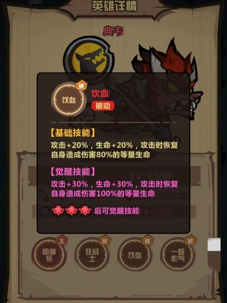 【饮血】:攻击+20%,生命+20%,攻击时恢复自身造成伤害80%的等量生命