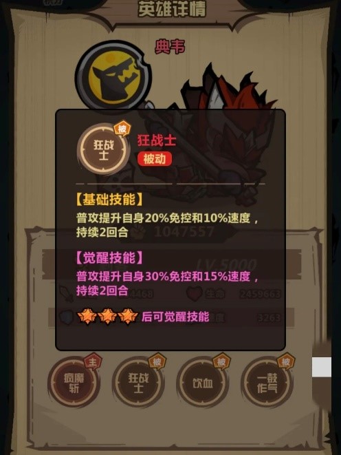 【狂战士】:普攻提升自身20%免控和10%速度,持续2回合