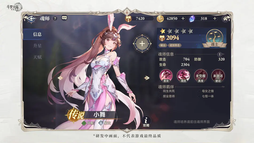 小舞是首冲赠送,获取门槛很低。其必杀拥有60%的暴击率,在前期拥有很强的单体突破能力;武魂真身下暴击可触发追击,平民玩家可以先把小舞养起来用来推图、副本。