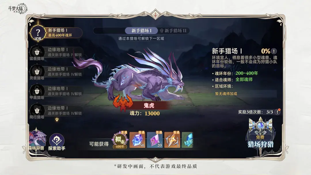 在战力提升后,要陆续挑战星斗大森林中的猎场,可获取魂环及养成资源。我们初期魂环缺口特别大,通过挑战可快速获取魂环、提升队伍战力 。星斗大森林每天有3次三倍奖励的次数(月卡可额外+1),要每天打满,因为初期缺口较大,可以多刷几次来补充魂环。除了星斗大森林外,我们还可通过“触发式礼包”来获取高年限魂环,更强的魂环配置可以让我们在开荒期间取得优势;