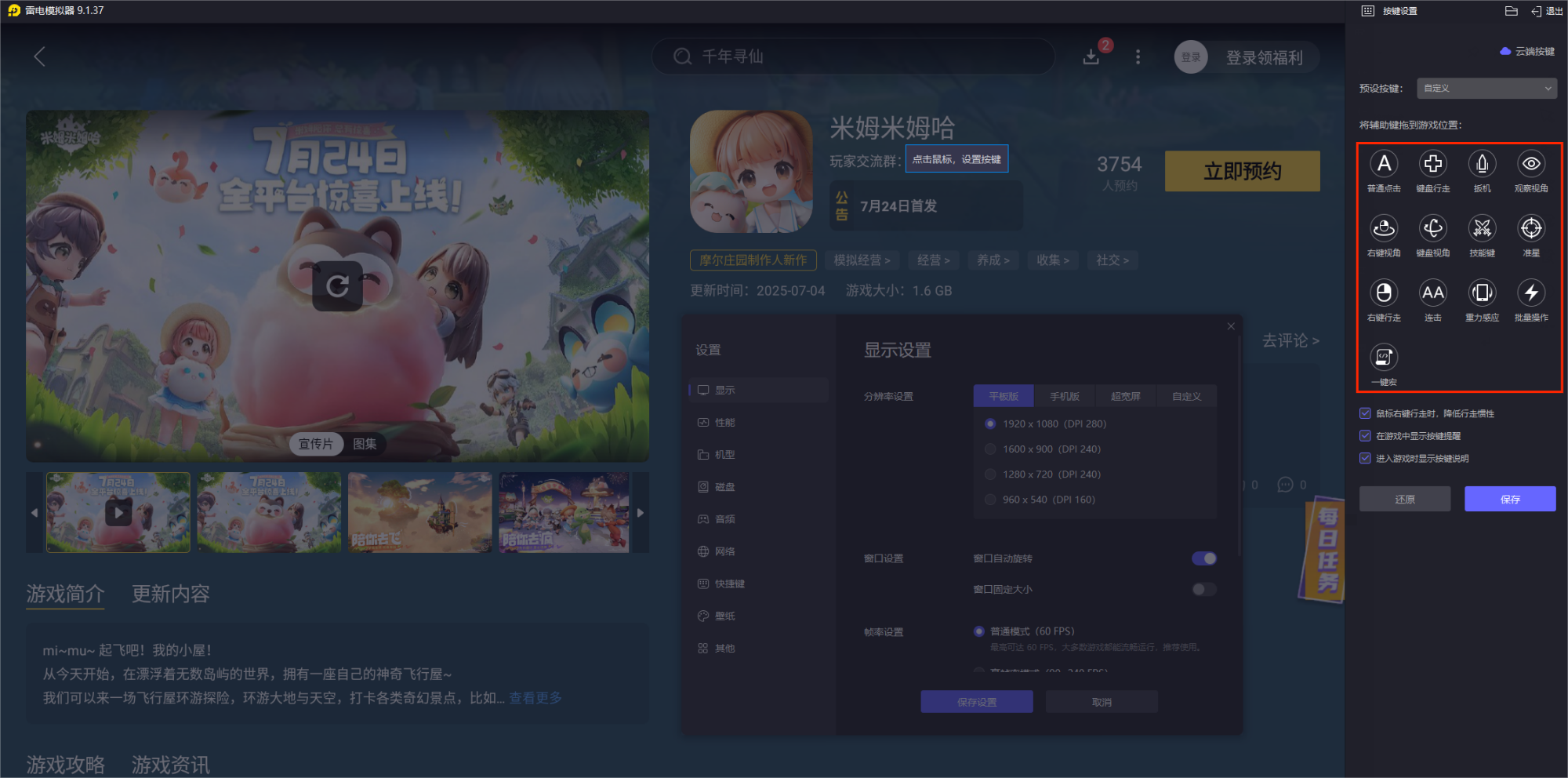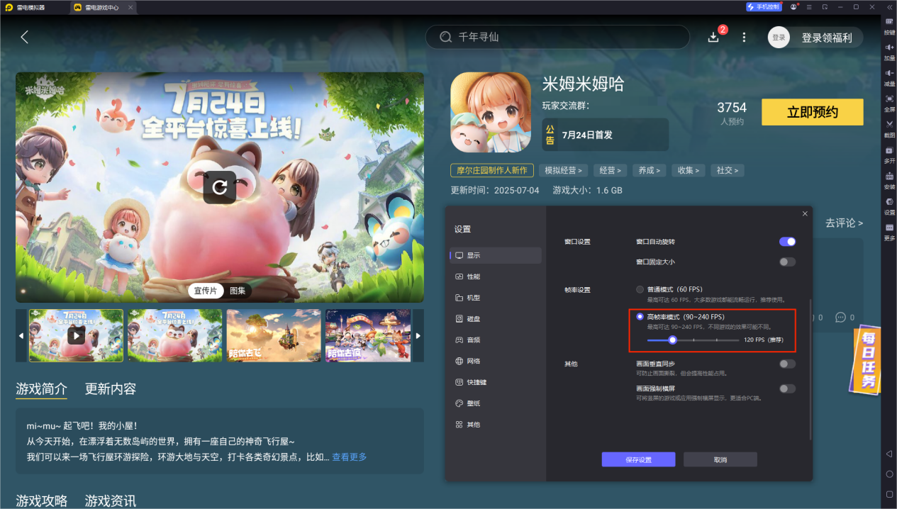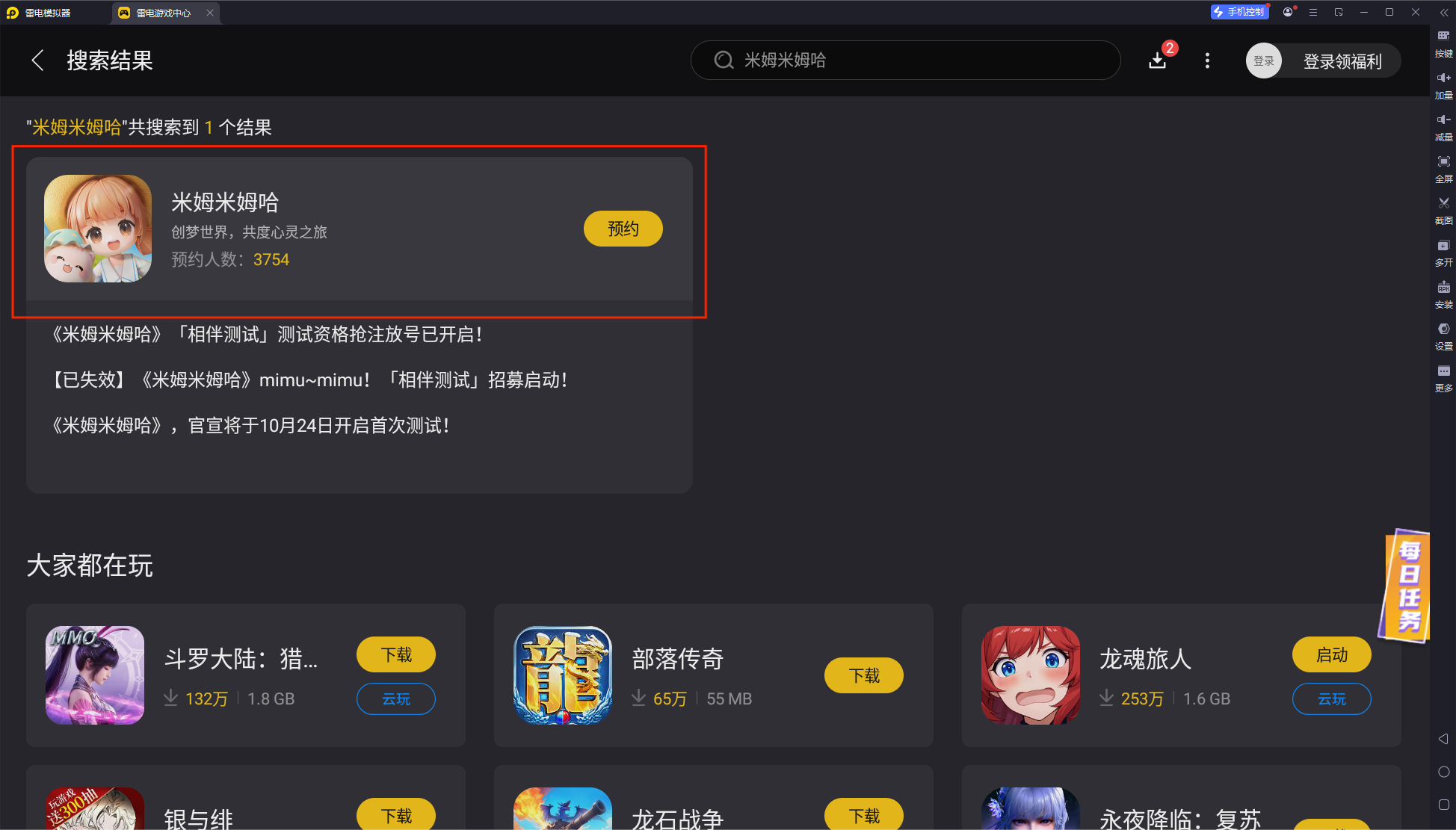搜索并预约游戏:打开雷电游戏中心,搜索"米姆米姆哈"进行预约。关注7月24日的正式上线通知即可进行下载。