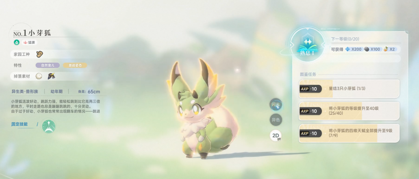 小芽狐的外形会随着进化不断变化,颜值越来越高。幼年期的它小巧可爱,毛茸茸的样子让人忍不住喜欢;第一次进化后变成“蓬尾狐”,体型变大,姿态变得优雅,毛发也更蓬松顺滑;最终进化成“萝冠灵狐”时,不仅体型大幅增长,头上还会出现小皇冠,像个威风凛凛的小boss,颜值直接拉满。
