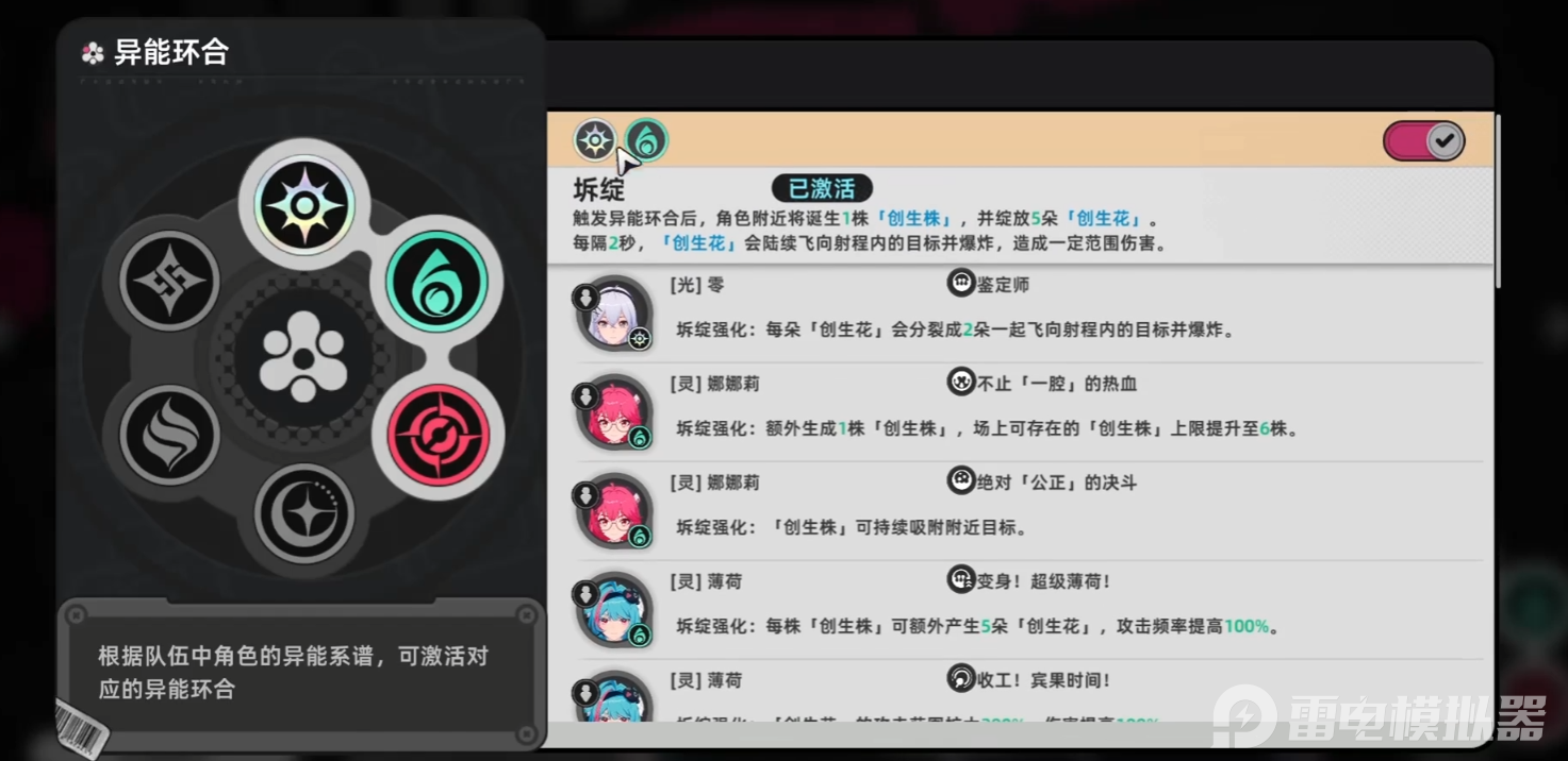 坼绽是光系异能与灵系异能角色协同作战时触发的特殊反应。当场上角色的环合系数累积至满值(通常通过攻击或技能充能),切换至光系与灵系属性相邻的角色时,会触发入轨攻击并立即启动坼绽效果。例如,光属性主角释放技能后切换灵属性角色薄荷,两者的异能环合将直接生成创生株并绽放5朵创生花。