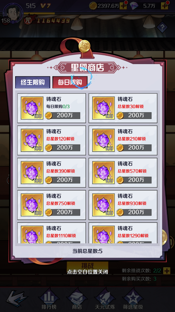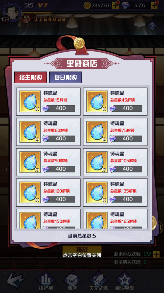 历练-薨星宫“里殿”为星级爬塔玩法,每个关卡挑战完成最多3个星,每次挑战均有不同的星级条件,达到一定累计星级即可领取相应星级奖励,以及购买相应的商城道具。