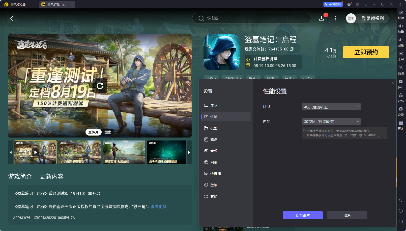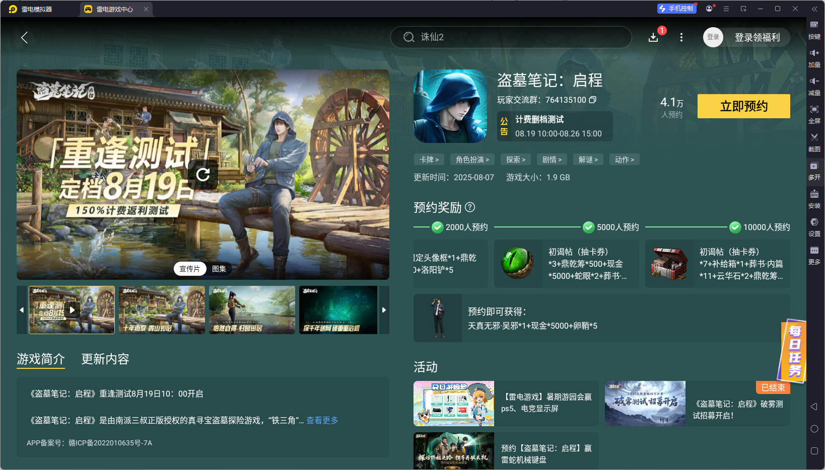 启动模拟器,找到雷电游戏中心并打开。在游戏中心的搜索栏中输入 “盗墓笔记:启程”,进入游戏主页,选择立即预约,等到盗墓笔记启程正式上线后即可下载安装。安装完成后,可在模拟器的应用列表或桌面快捷方式中找到的盗墓笔记启程图标,双击即可启动游戏。