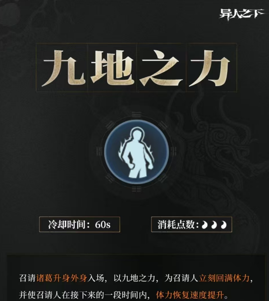 以上就是异人之下手游九地之力怎么样的介绍了,作为一个强大的三消耗的技能,强度中规中矩,因玩家的战术使用而强大,使用得当的时候提升巨大,使用诸葛升这个角色最能展现这个技能的特效,赶快来试一下吧。