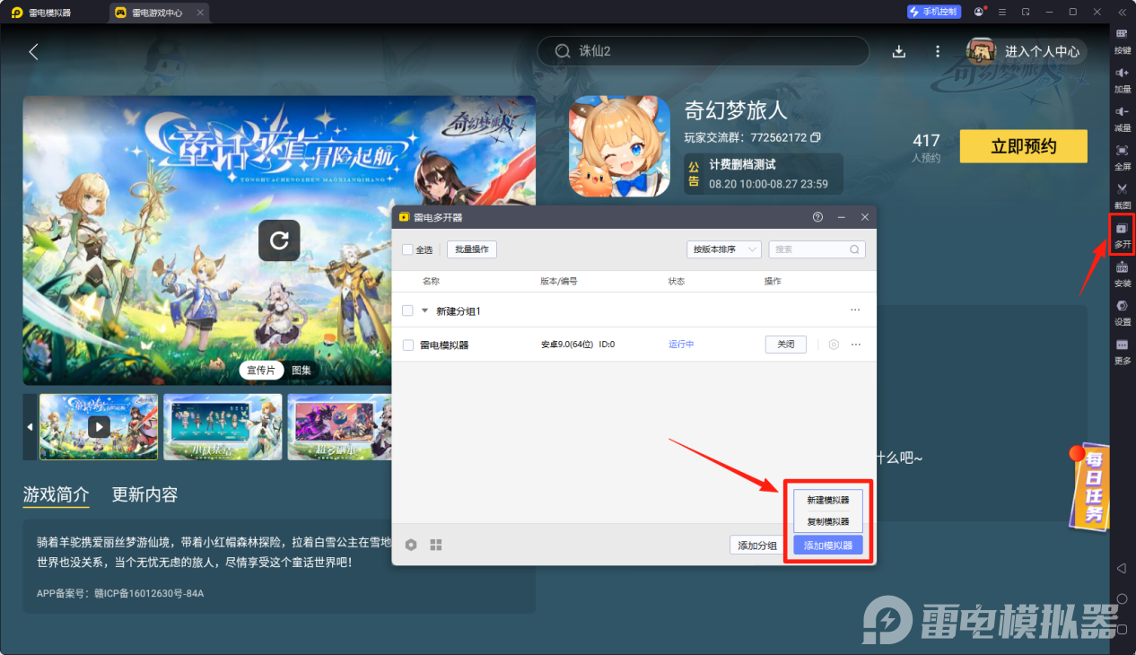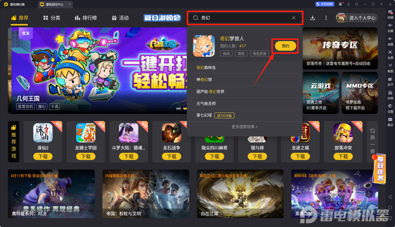 启动模拟器后,打开雷电游戏中心搜奇幻梦旅人,没上线就点预约,上线了直接下载,装好双击图标就能玩。