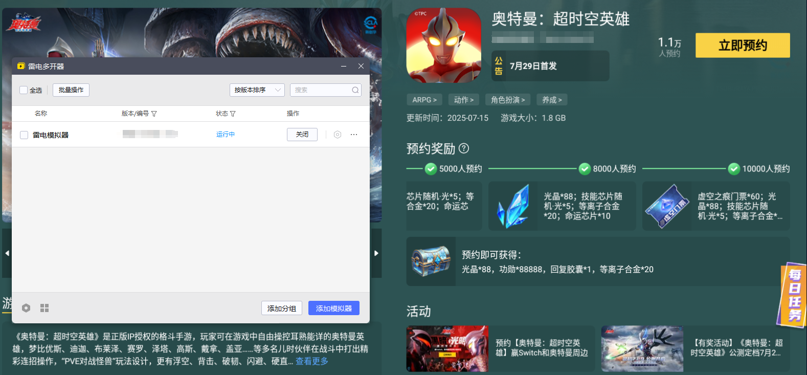 想要预约奥特曼超时空英雄,大家可以打开雷电模拟器,在雷电模拟器的雷电游戏中心输入正确的游戏名字,就可以进去到游戏的专属板块,点击立即预约就可以成功预约游戏了。